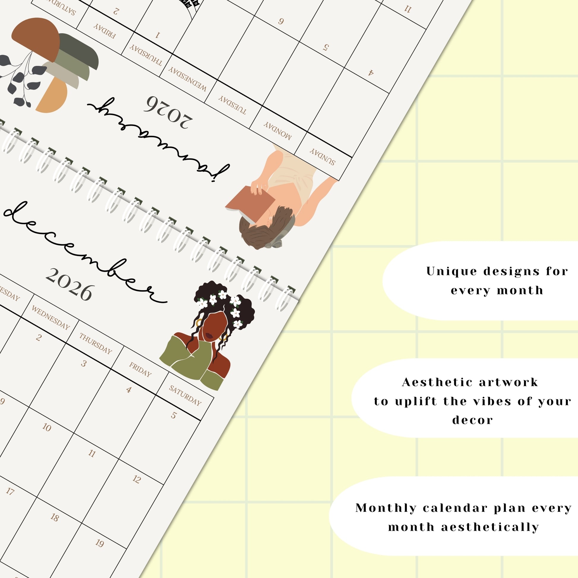 Boho Illustration Desk Calendar 2026 - 6x8 inches